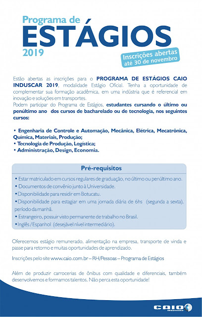 A Caio Induscar divulgou para o Acontece Botucatu nesta terça-feira, dia 18, vagas atualizadas de emprego que estão em aberto no Grupo.