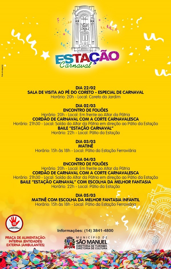 ARNALDO: Como é a última sexta feira do mês de fevereiro, e antecede o Carnaval, considero o primeiro grito de Carnaval, a abertura oficial das festividades desse ano. Quando o relógio do Museu der os badalos às 20 horas, começamos com as apresentações de marchinhas e com vários artistas que quiserem se apresentar ali aos pés do Coreto do Jardim Público. Às 22 horas encerramos. O relógio do Museu dá os badalos das 22 horas e paramos automaticamente. Pode estar no meio de uma apresentação. Paramos e ponto final! Mas são duas horas de muita alegria, arte e cultura!